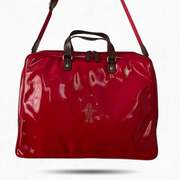 Premium Collection | Large Vegan Enamel Leather Briefcase with Genuine Leather Handles & Juggling Robot Print | Red