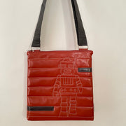 Made with mostly all-faux leather, apart from the genuine leather black accents, this unique bag is adorned with a geometric design of a large and yet somehow subtle robot character made apparent with a masterful stitching technique. A adjustable strap and zippered pockets on the inside and the outside represent Highway's high standard of practicality and ease of use. Although this style is large with maximum capacity, the material is durable and lightweight for a burden-free result. The bag's body colors are sophisticated and urban chic. Perfect for travel, work and pleasure.