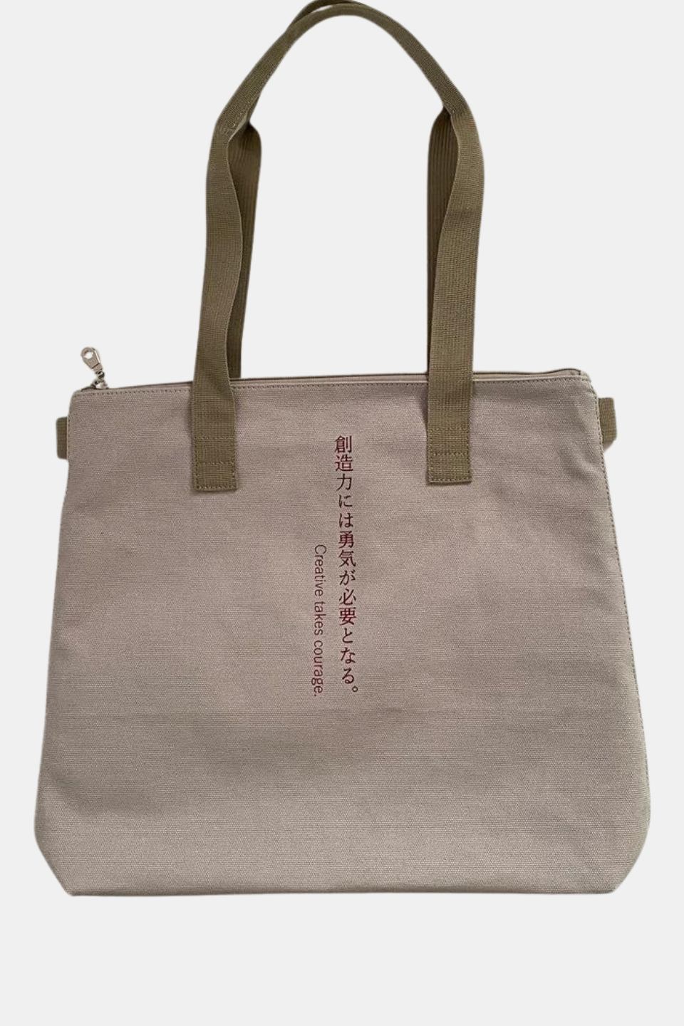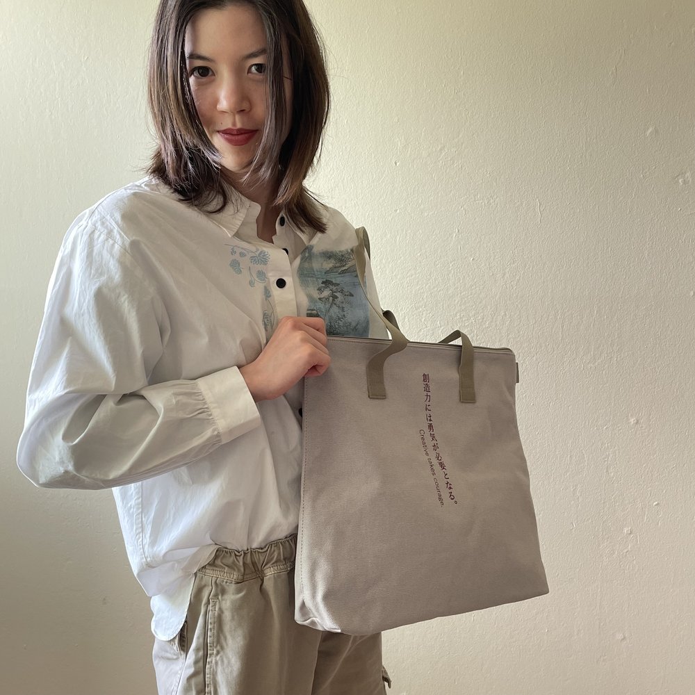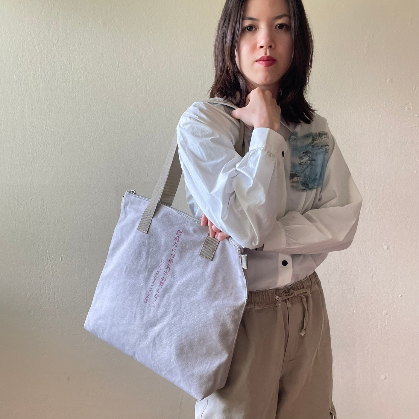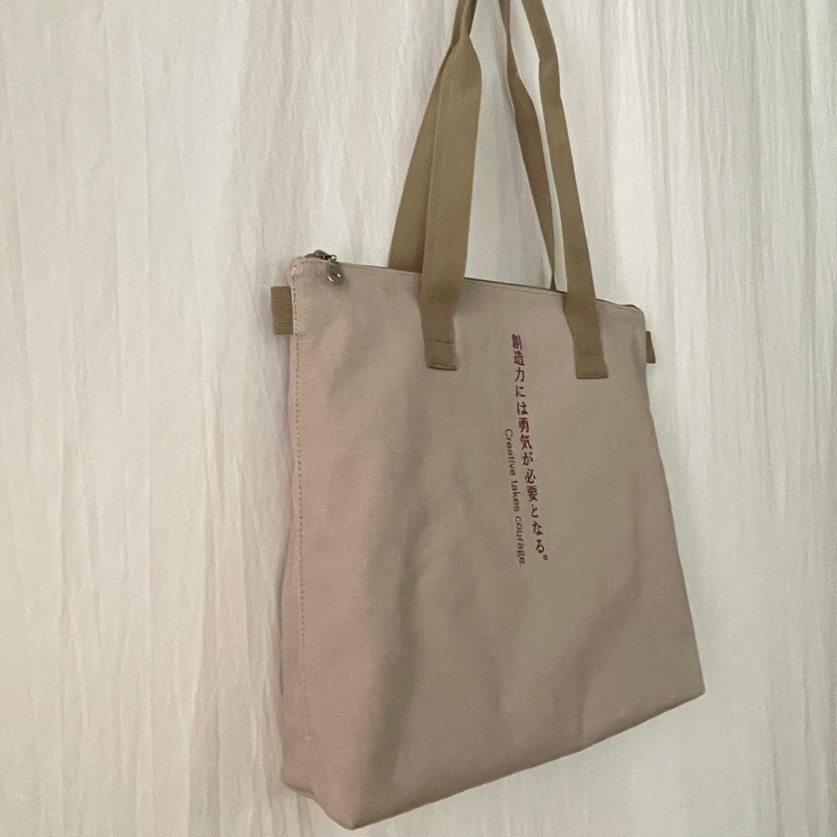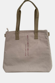 This medium-sized tote bag with multiple pockets for practical use is made of durable, soft cotton and has a unique text print accent, along with sophisticated metal zipper accents. Perfect for everyday wear year-round on any occasion, and guaranteed to serve as your steady companion anywhere you go.