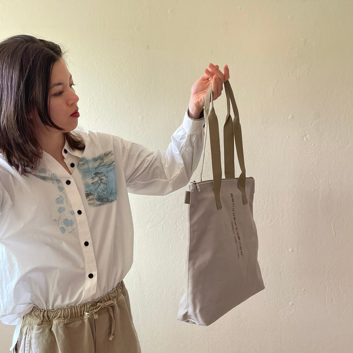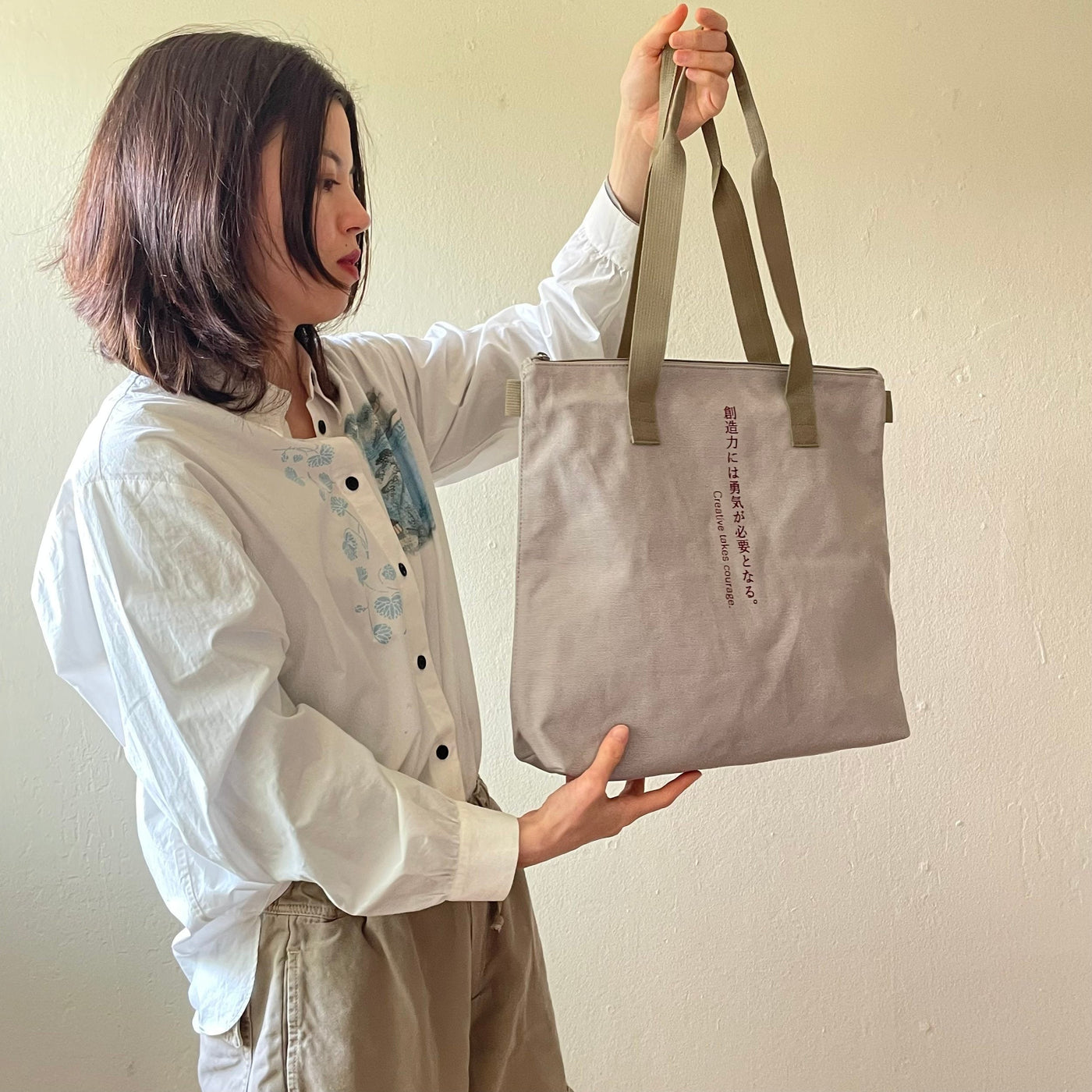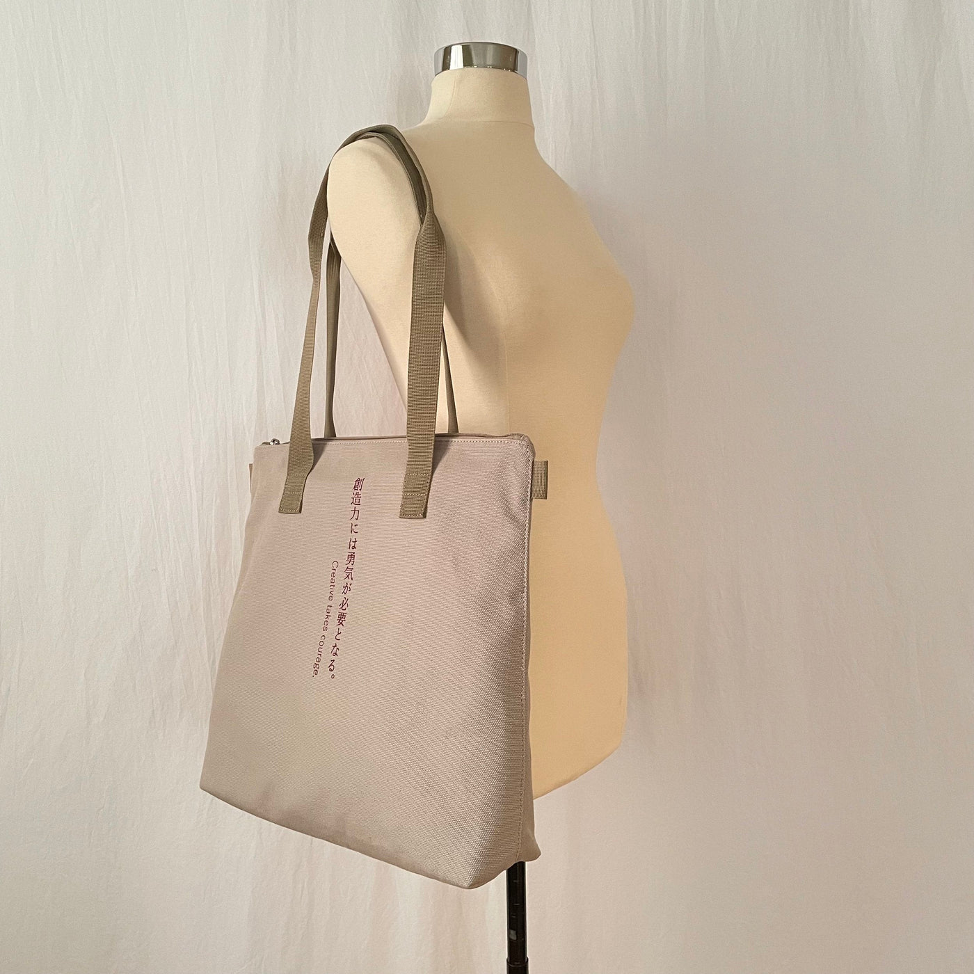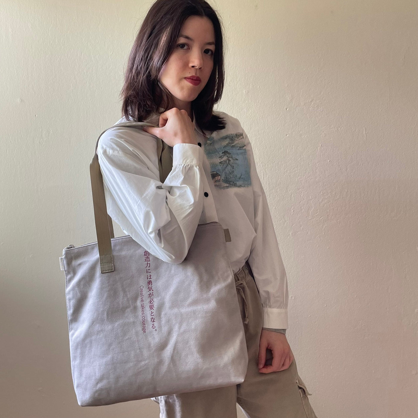 This medium-sized tote bag with multiple pockets for practical use is made of durable, soft cotton and has a unique text print accent, along with sophisticated metal zipper accents. Perfect for everyday wear year-round on any occasion, and guaranteed to serve as your steady companion anywhere you go.