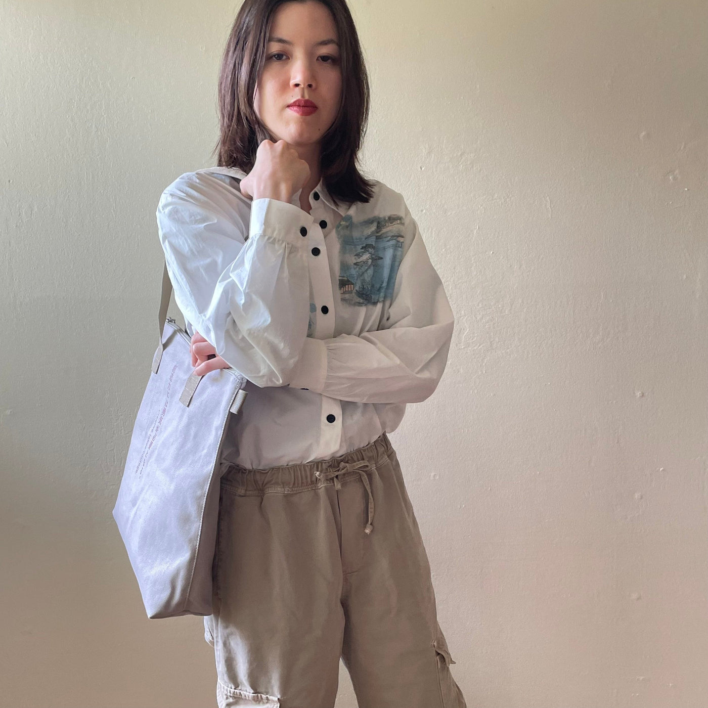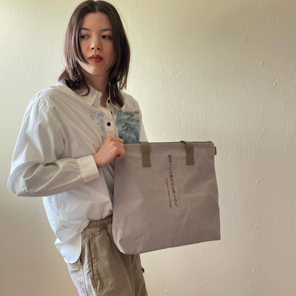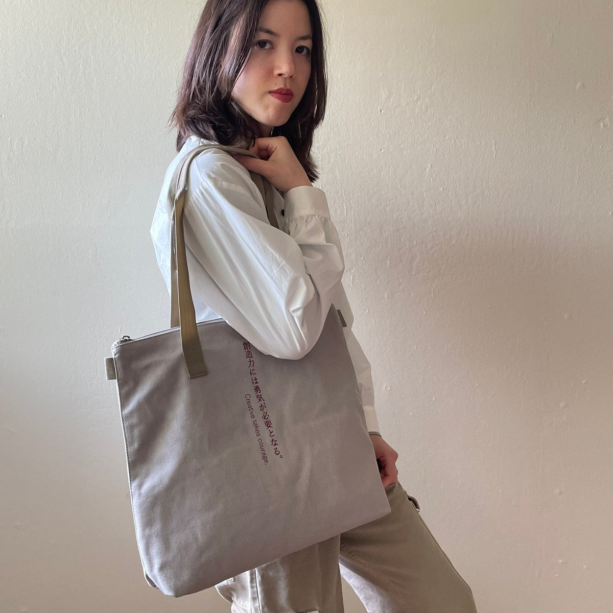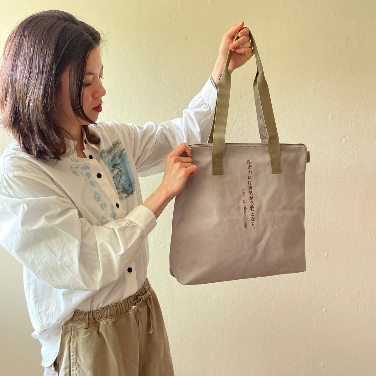 This medium-sized tote bag with multiple pockets for practical use is made of durable, soft cotton and has a unique text print accent, along with sophisticated metal zipper accents. Perfect for everyday wear year-round on any occasion, and guaranteed to serve as your steady companion anywhere you go.